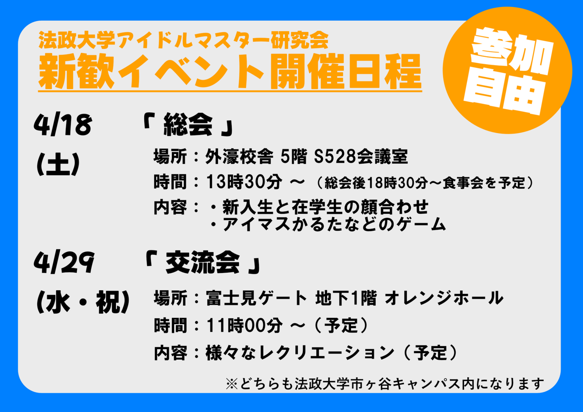市ヶ谷キャンパス及び多摩キャンパスで開催される新歓祭の開催日、開場時間、開場場所などの情報を追加しました。